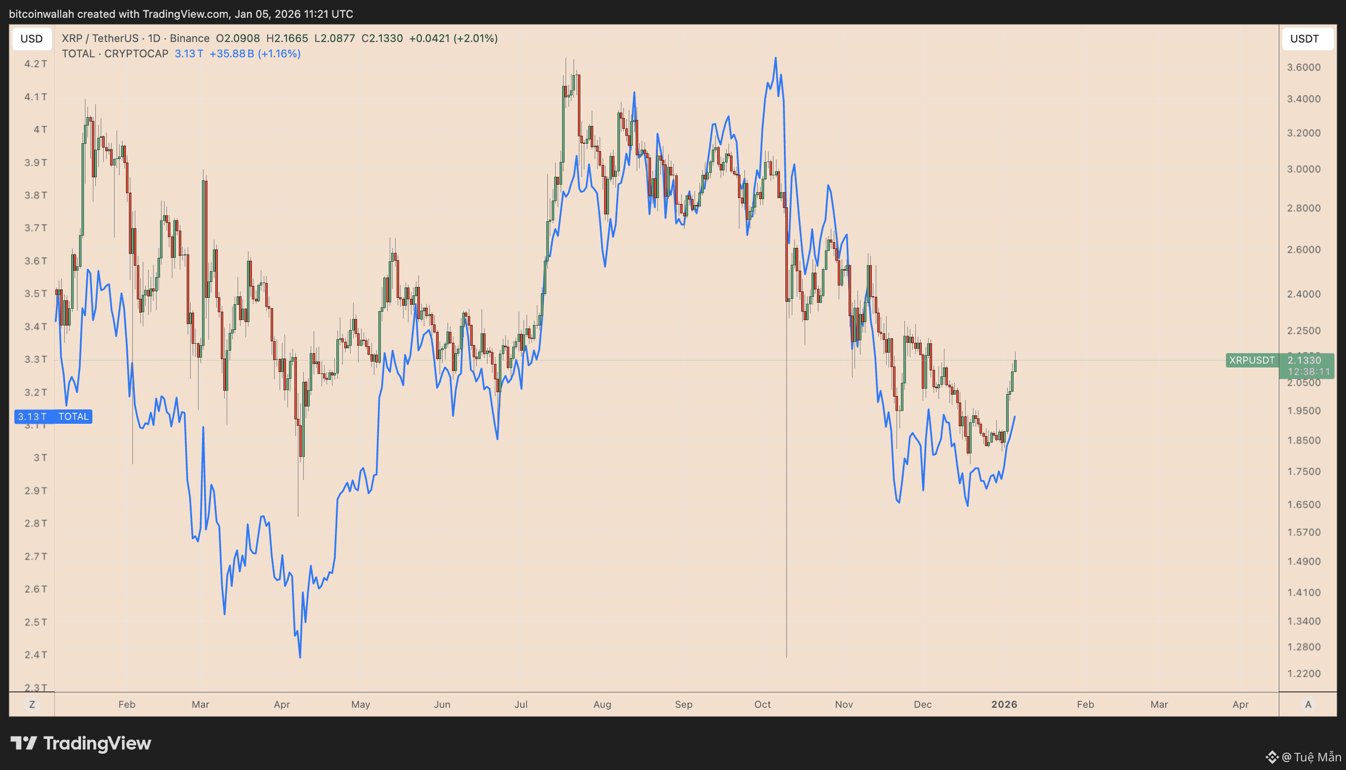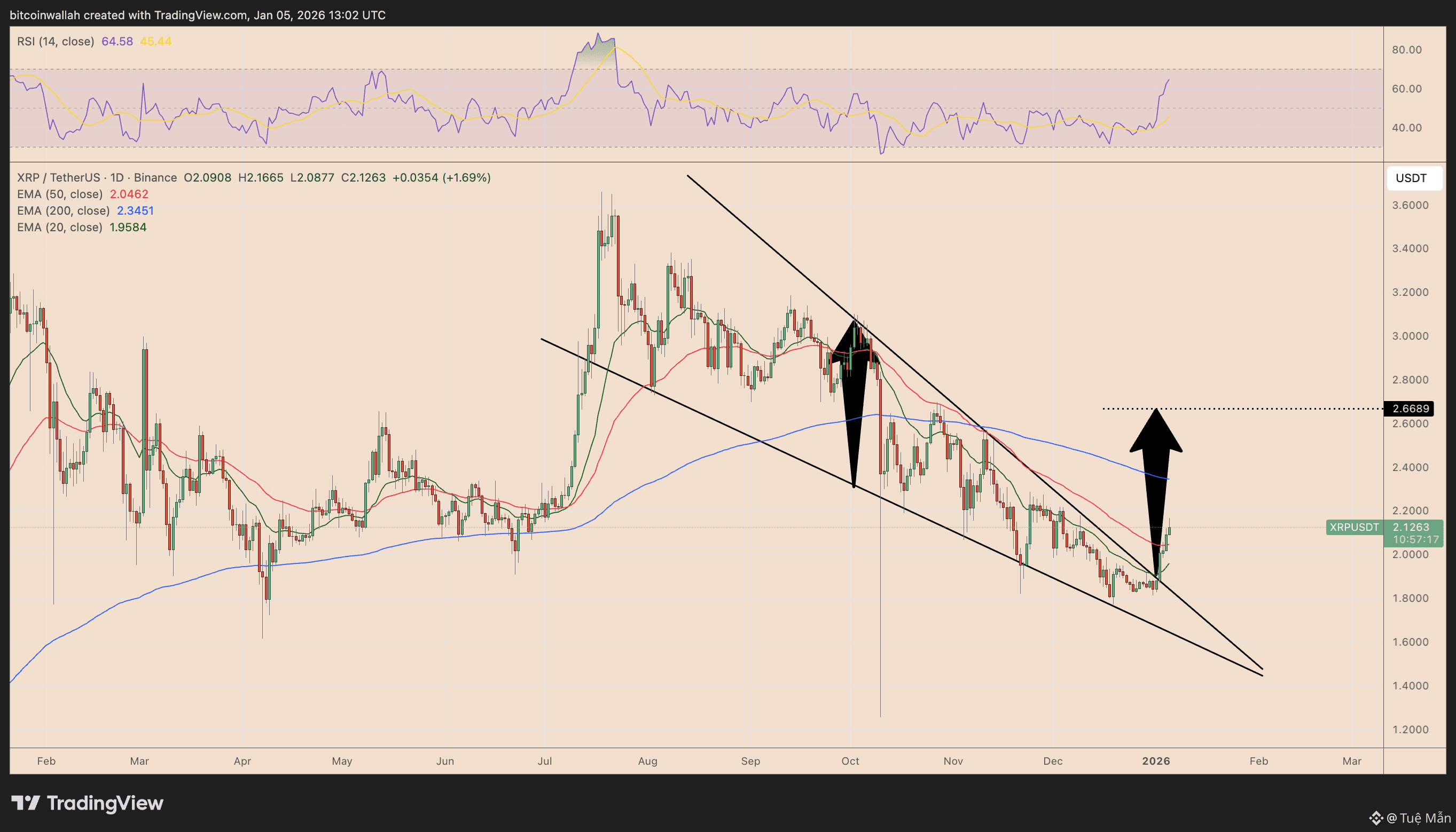 Đầu tháng 1, XRP đã bứt phá lên trên đường xu hướng phía trên của nêm, quanh vùng $2,05–$2,10, đồng thời chỉ số sức mạnh tương đối (RSI) cũng cải thiện rõ rệt.
