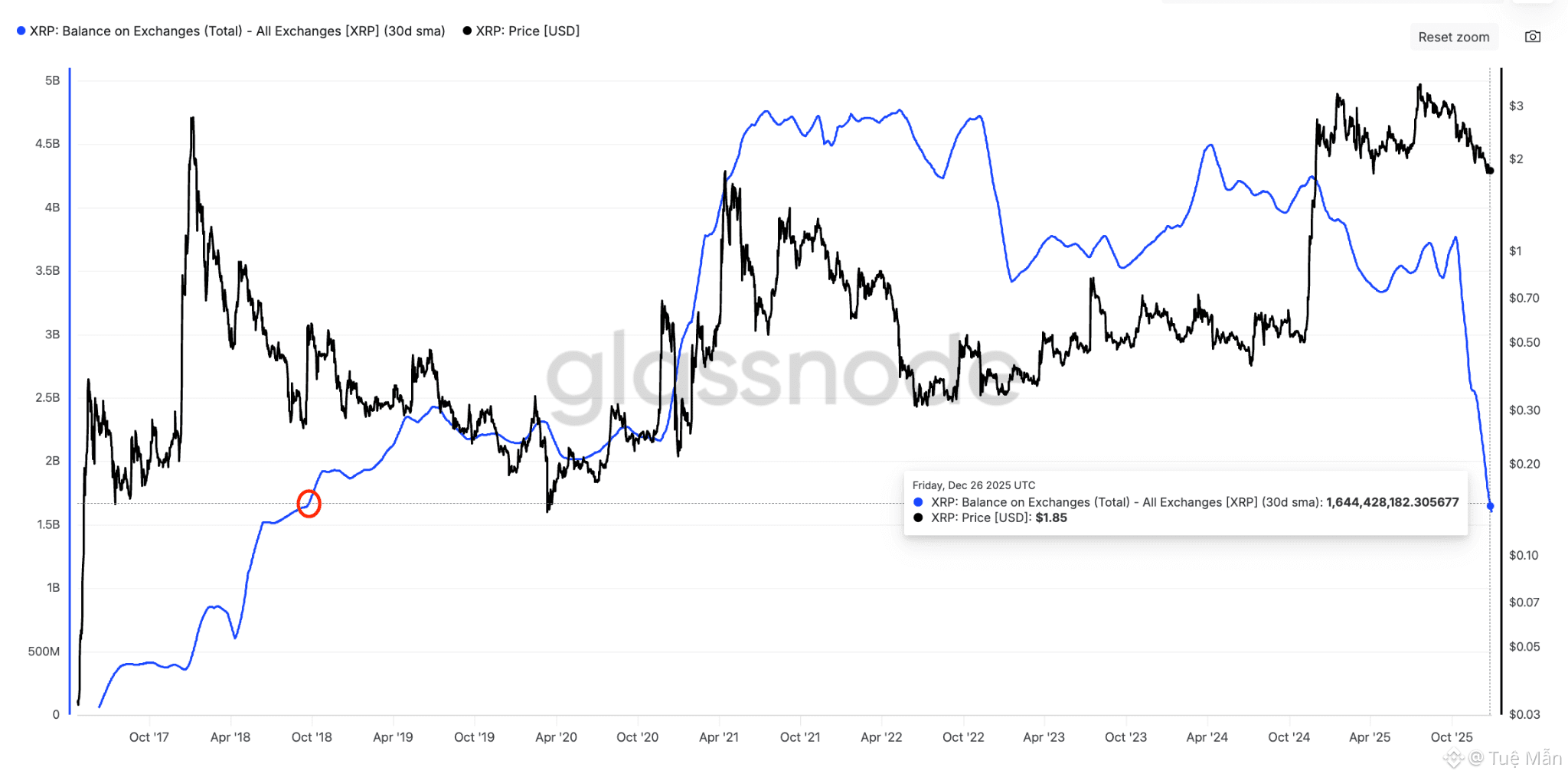 Đồng thời, lượng XRP trên các sàn giao dịch đã giảm xuống mức thấp nhất kể từ năm 2018, phản ánh thanh khoản bên bán đang co hẹp.