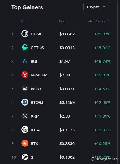 SUI (+16.74%): Currently priced at $1.97, SUI is a high-performance Layer 1. Its presence here suggests that the "Sui Summer" or ecosystem growth is maintaining significant momentum.