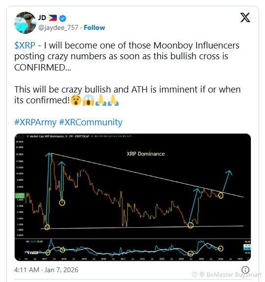JD berpendapat bahwa begitu silang dominasi bullish dikonfirmasi, perilaku pasar bisa berubah dengan cepat. Siklus sebelumnya menunjukkan bahwa XRP cenderung bergerak secara eksplosif hanya setelah dominasi melewati batas, bukan sebelumnya. Ketika rotasi modal mempercepat, harga sering mengikuti dengan sedikit hambatan.