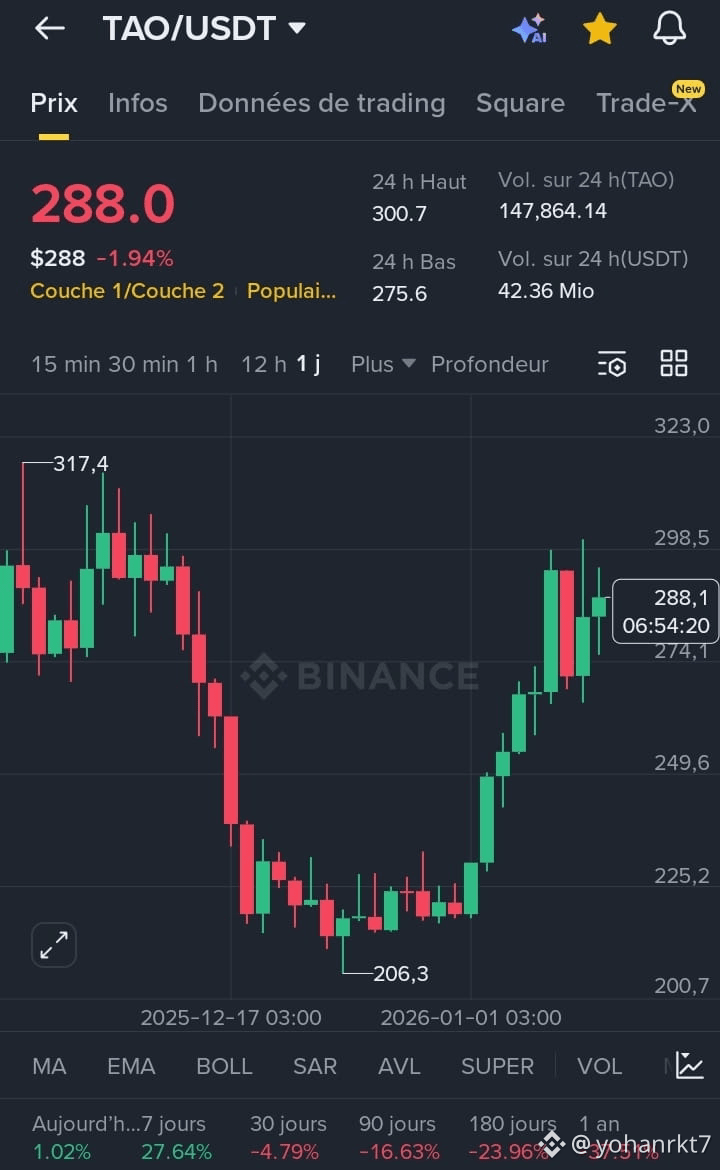 Prix Actuel : Le TAO se négocie autour de 280 $ - 396 $ selon les plateformes, avec une hausse spectaculaire de 27 % sur la première semaine de l'année.