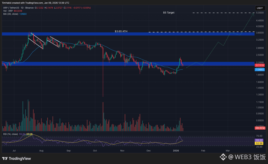 在赢得与美国证券交易委员会(SEC)的长期诉讼后,XRP 价格在 2025 年中期飙升至历史高点 3.65 美元,随后回落至 2.09 美元左右。近期美国推出的现货 XRP ETF 为传统投资者提供了入场机会,也带动了 XRP 过去一周上涨约 11%。分析师认为,如果监管明确,XRP 有望在第一季度挑战 5 美元,甚至在年内冲击 10 美元。