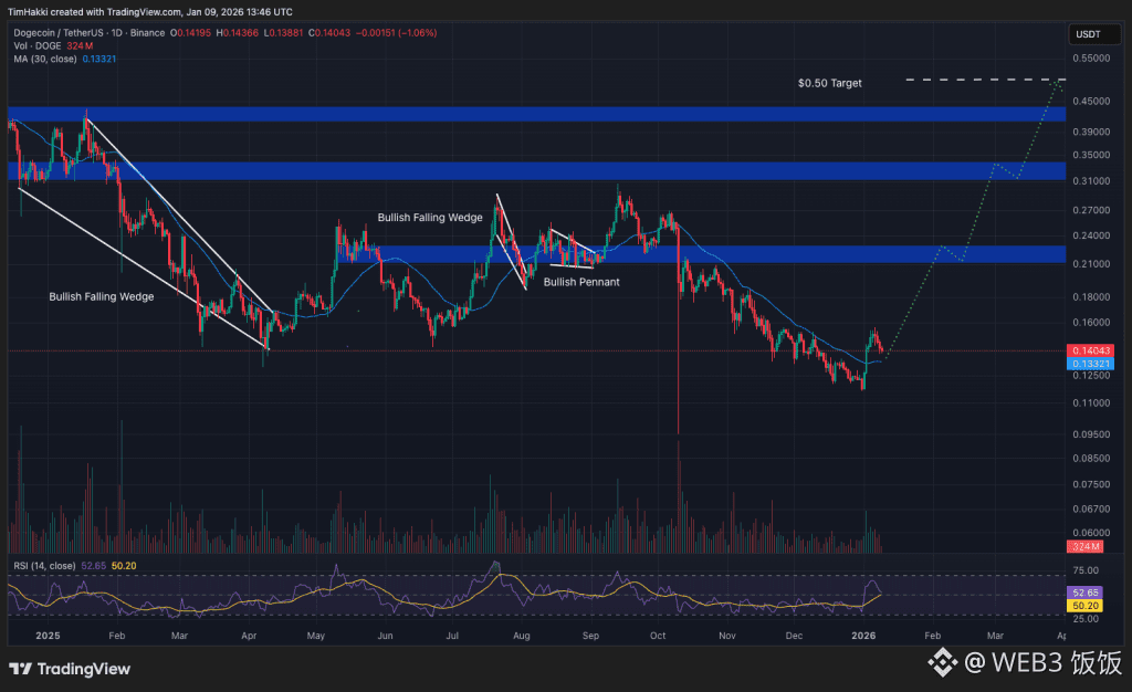 “狗狗币涨到 1 美元”的口号仍在粉丝中流行,不过如果没有监管上的实质性进展,实现这一目标仍有难度。政策变化或新的项目计划可能让狗狗币在春季从 0.14 美元涨到 0.50 美元。与此同时,实际应用也在稳步扩展,特斯拉、PayPal 和 Revolut 已支持狗狗币支付和交易。
