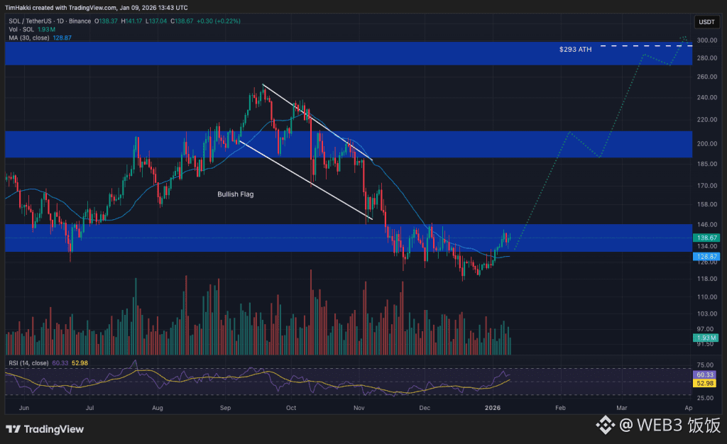SOL 目前在 137 美元附近关键支撑位交易,如果能突破 250 美元的阻力位,本季度末有望刷新历史高点 293.31 美元,并有机会在年中挑战 500 美元。除了价格,Solana 还逐渐成为现实世界资产代币化的首选平台,多家金融机构正在利用其网络发行代币化投资产品。