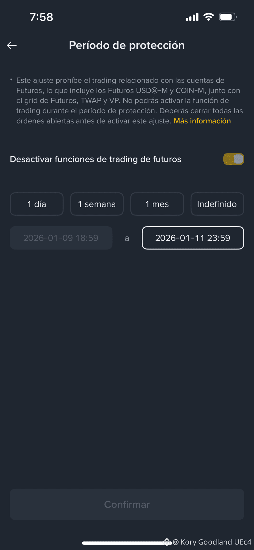 La Función #PeríododeProtección te permite bloquear o “freezear” tus operaciones en Futuros por un periodo de tiempo para no tener la tentación de seguir operando y mantenerte en la raya. Para ingresar, entra en la sección de #Futuros , en los 3 puntos suspensivos de la esquina superior derecha y escoge la opción #PeríododeProtección por el tiempo que consideres necesario.