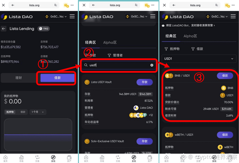 打开Lista DAO官方网站,用持有BSC链BTCB的钱包扫码快速关联平台。先进入“借贷-供应”板块存入BTCB完成抵押,再切换至“借款”专区选择USD1借款池,按照页面指引输入借款金额后确认即可。核心优势:当前全市场高利率背景下,借USD1年化成本仅1%,远低于行业平均水平,为稳定盈利筑牢基础。