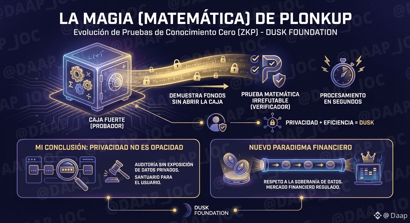 Si te gusta la tecnología, el protocolo PlonKup es lo que realmente te vuela la cabeza. Es la evolución de las pruebas de conocimiento cero (ZKP). En mis pruebas y lecturas, lo entiendo como el "juego de la caja fuerte": yo puedo demostrarte que dentro de mi caja hay fondos suficientes para comprarte un NFT o un activo del mundo real, y puedo hacerlo sin abrir la caja. Tú recibes una prueba matemática irrefutable, yo mantengo mi privacidad, y la red lo procesa en segundos. Esa eficiencia es lo que permite que Dusk no sea lento, algo que siempre ha sido el talón de Aquiles de la privacidad.