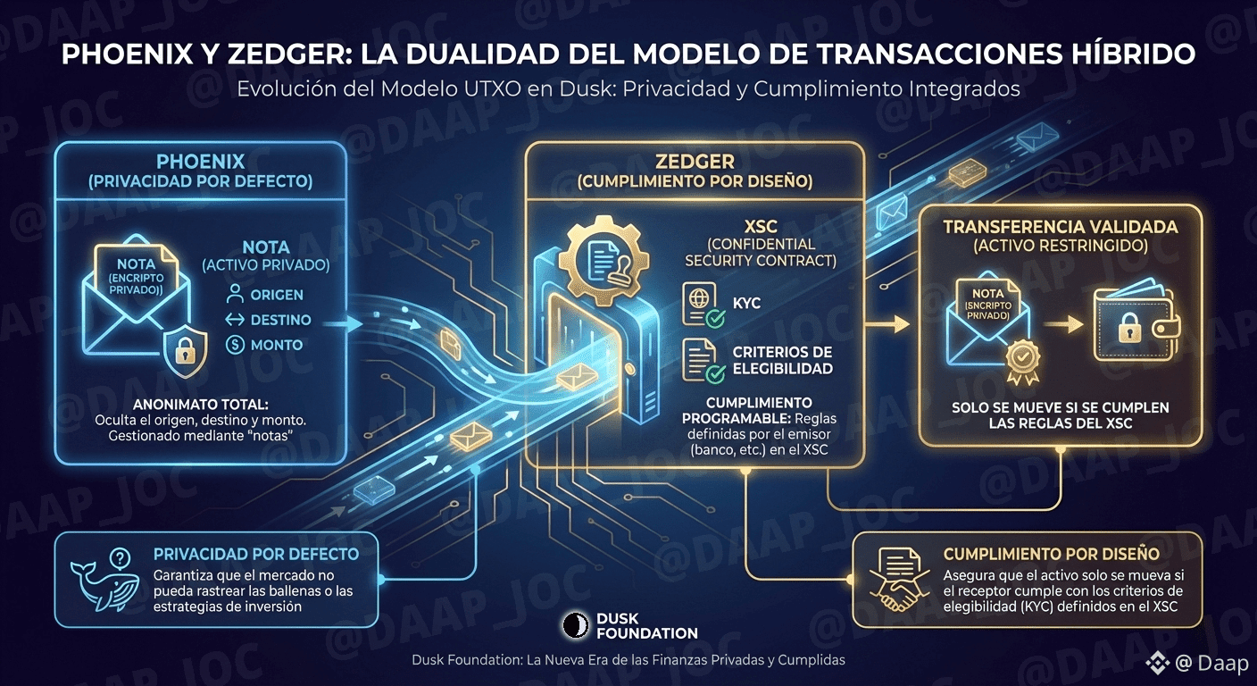 @Dusk no se limita a copiar el modelo de cuentas de Ethereum. Implementa Phoenix, un modelo de transacciones diseñado para el anonimato total, donde las transacciones se gestionan mediante "notas" que ocultan el origen, destino y monto. Sin embargo, el genio técnico reside en su complemento: Zedger.