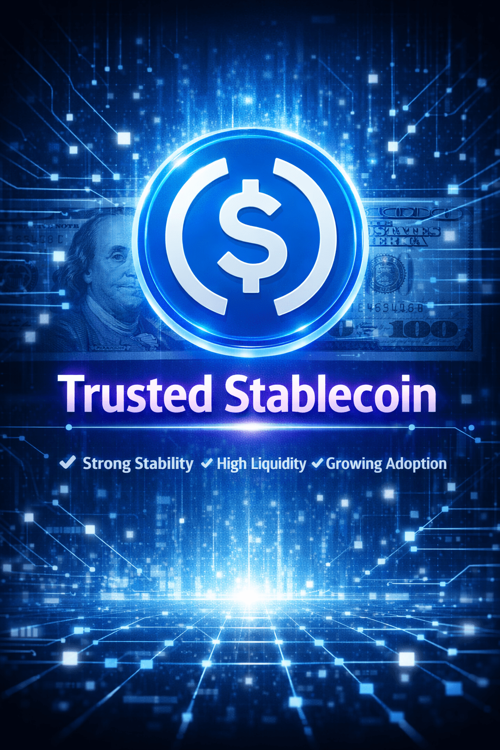 Grafik crypto yang bersih menunjukkan logo USDC yang bersinar di atas latar belakang dolar digital, garis blockchain, tema biru & putih, teks “Stablecoin Terpercaya”, gaya keuangan modern.
