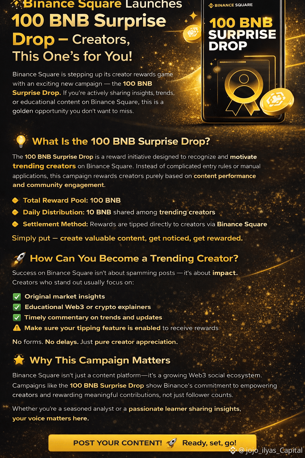 The 100 BNB Surprise Drop is a reward initiative designed to recognize and motivate trending creators on Binance Square. Instead of complicated entry rules or manual applications, this campaign rewards creators purely based on content performance and community engagement.