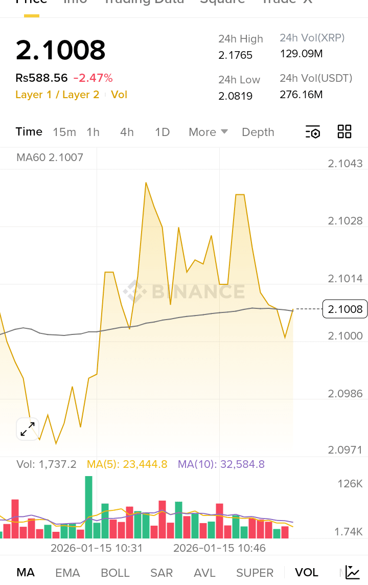 XRP experienced slight downward pressure today. This decline is mainly linked to mixed reactions surrounding a U.S. Senate crypto market structure bill. Some traders took profits after recent gains, causing short-term selling pressure. However, bulls are still defending key support levels, indicating that XRP has not lost its broader bullish structure.