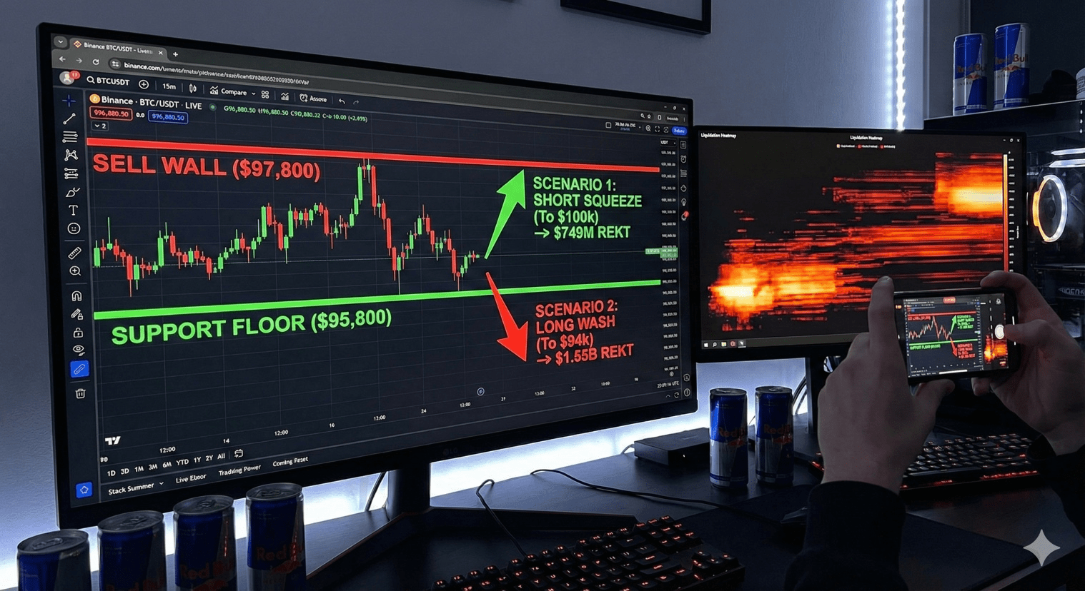 • "Long Wash" (Ke Bawah): Di bawah $95.800, terdapat "Kesenjangan Likuiditas." Jika harga menembus dukungan ini, bisa langsung melonjak turun ke $94.000 untuk menyerang $1,55 miliar likuidasi posisi long.
