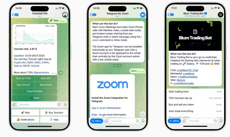 Kategori aplikasi: Bot mencakup banyak bidang, termasuk otomatisasi layanan pelanggan (mendukung pembayaran dan distribusi konten), game (Telegram Mini Apps menarik 87 juta pengguna untuk berinteraksi dalam game kripto), alat AI (AI generatif seperti ringkasan pos) dan perdagangan kripto (sinyal, sniper, dan alat otomatisasi).
