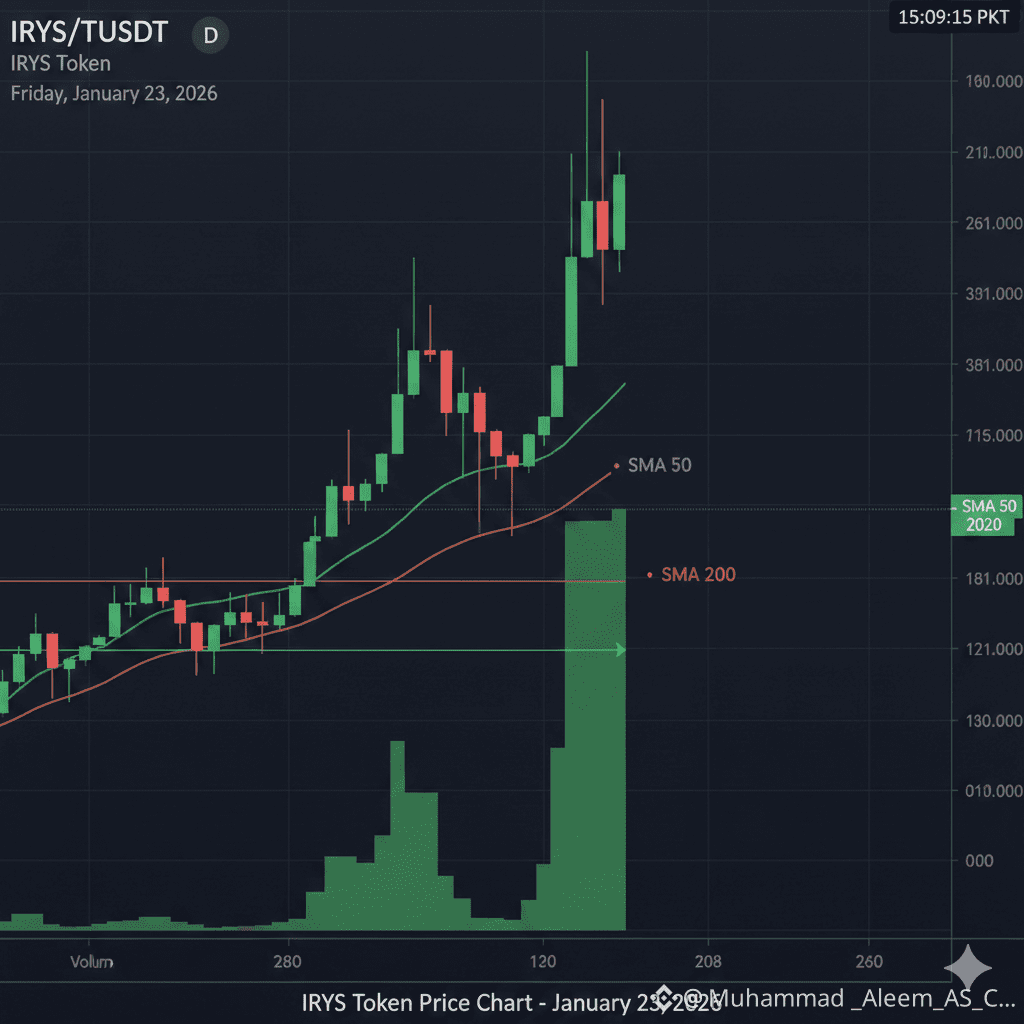 Market mein jab "Verifiable Storage" aur AI data ki baat aati hai, toh IRYS ka structure is waqt sabse zyada aggressive nazar aa raha hai. Chart par ek bohot hi clean impulse move dekhne ko mila hai—$0.45 ke low se uth kar price ne local resistance ko cheer diya hai! Sabse badi baat ye hai ki dips par volume bilkul drop nahi ho rahi, buyers har level ko "scoop up" kar rahe hain.