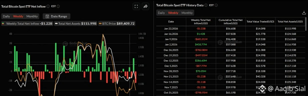 Spot Bitcoin ETFs in the U.S. saw $1.22 BILLION in outflows through Thursday — the biggest weekly withdrawal wave since November. That’s not retail panic. That’s big capital reducing exposure.