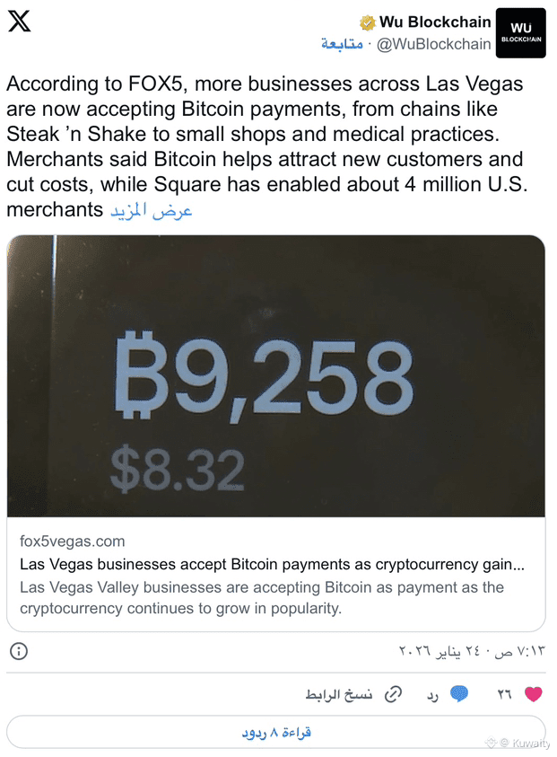 تتحول لاس فيغاس إلى نقطة جذب لمدفوعات $BTC في عام 2026. ووفقاً لتقرير من FOX5، بات عدد متزايد من الشركات في المدينة يقبل عملة BTC في المشتريات اليومية. ويشمل ذلك سلاسل وطنية مثل Steak ’n Shake، إضافة إلى مقاهٍ صغيرة، ومتاجر عصائر، وحتى عيادات طبية.