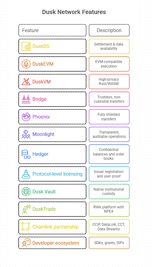 Kemudian ada DuskVM yang merupakan tempat logika privasi berat berada. Aplikasi pengetahuan nol Rust WASM. Ini tidak untuk semua orang tetapi ada untuk tim yang membutuhkan kriptografi dalam alih-alih privasi tingkat permukaan.