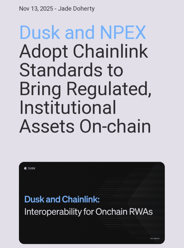 Saya masih baru dalam hal ini, jadi saya memposting ini seperti jurnal pembelajaran. Saya menemukan pembaruan blog resmi @Dusk (13 Nov 2025) tentang Dusk + NPEX yang mengadopsi standar Chainlink untuk membantu membawa aset institusi yang diatur ke dalam rantai. Saya membagikannya sekarang karena saya mencoba memahami apa yang $DUSK sebenarnya bangun dan mengapa #Dusk terus menyebutkan keuangan yang diatur dan privasi bersama.