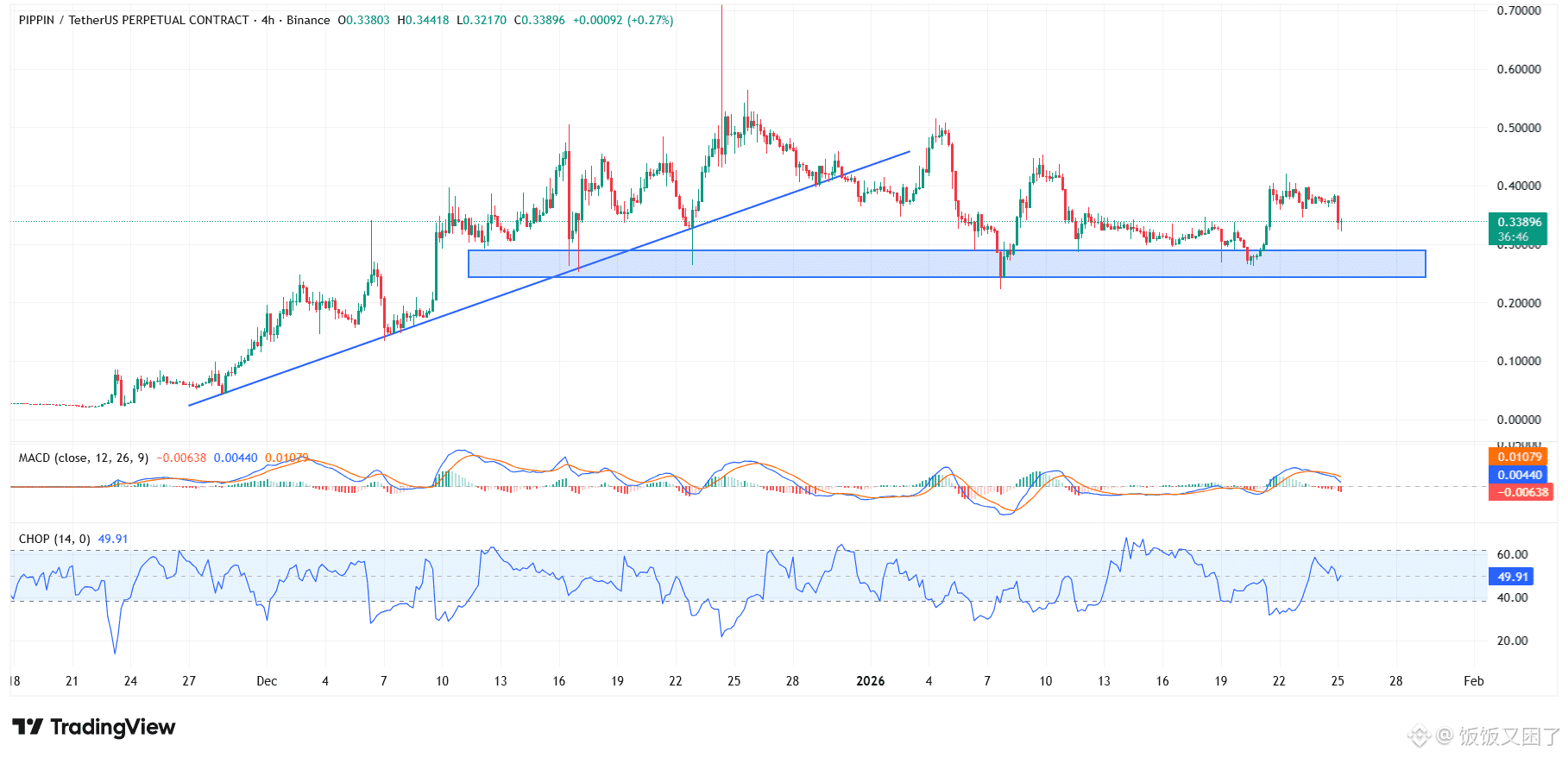 从指标来看,PIPPIN 当前的波动指数(CHOP)在 49 左右,显示价格主要在 0.28 美元到 0.50 美元之间来回震荡。