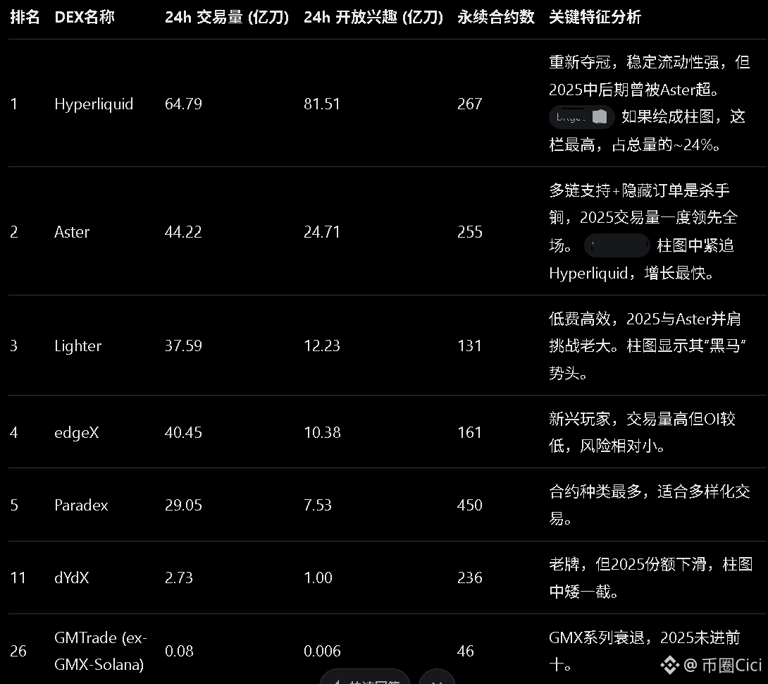 2025累计数据假设Hyperliquid占30%、Aster25%、Lighter20%、dYdX10%、GMX及其他15%),从数据上看出Hyperliquid的“瘦身”和新秀的“抢滩”。