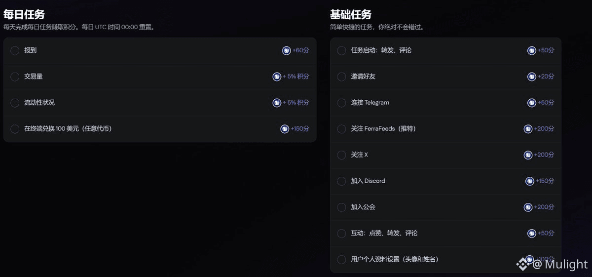 Ferra也集成了Terminal,Swap,流动性挖矿等功能,还有每日任务可以完成获取积分。