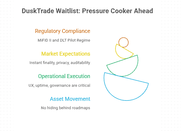 Daftar tunggu DuskTrade sekarang dibuka dan di sinilah teori mulai terasa tidak nyaman. Lebih dari tiga ratus juta euro dalam sekuritas yang ter-tokenisasi direncanakan melalui NPEX, sebuah bursa Belanda yang diatur.
