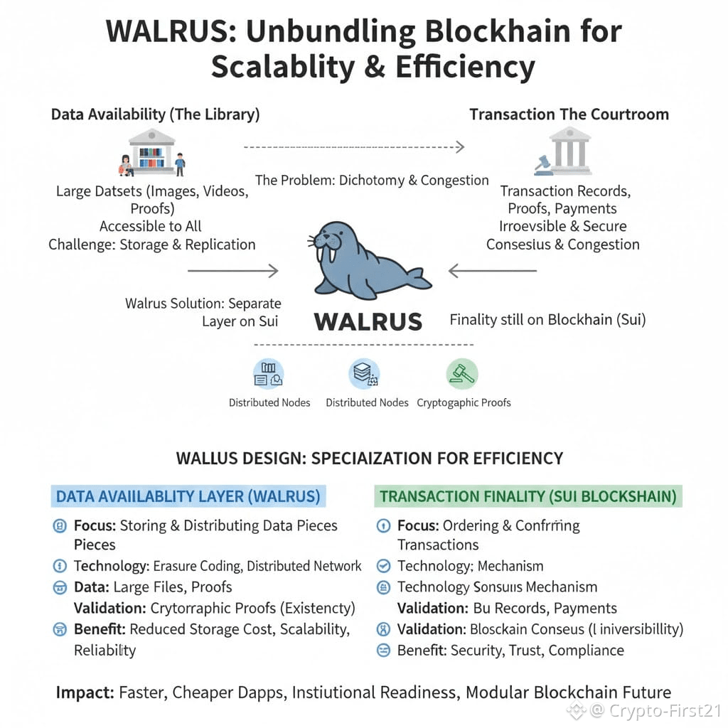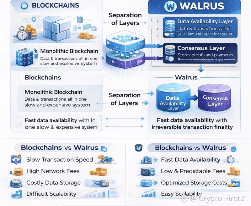 To illustrate why this is significant, let’s consider how blockchains typically function. In a transaction, we have the need to make the information available to anyone on the network who wants to check it, and also make it final and immutable. This is like trying to have a library and a courtroom function at the same time, in the same place. It’s a congestion problem. Data availability, when it comes to large amounts of data like images, videos, or proofs, is also a storage problem. Finality is the other consensus problem. These happen at different speeds depending on the ruleset. Walrus is built with this in mind. Walrus is built in such a way that data availability is a separate layer on the Sui blockchain, not slowed down by replication or consensus.