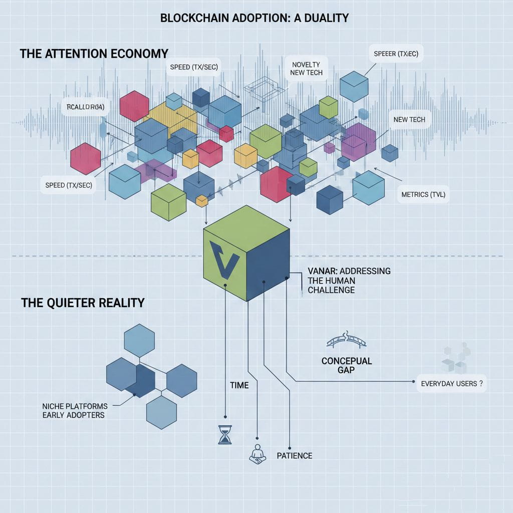 Vanar arrives in a space that grows noisier each year. Modern blockchains don’t just compete on technical ideas; they compete for attention. Speed, scalability, novelty, and metrics are frequently used as markers of importance. Beneath that surface, however, the reality is far quieter. Most platforms are still used by a relatively small audience that already understands how they work. The long-promised connection to everyday users remains more conceptual than practical. Vanar appears to recognize this disconnect, not as a flaw that can be patched quickly, but as a human challenge that requires time, patience, and empathy.