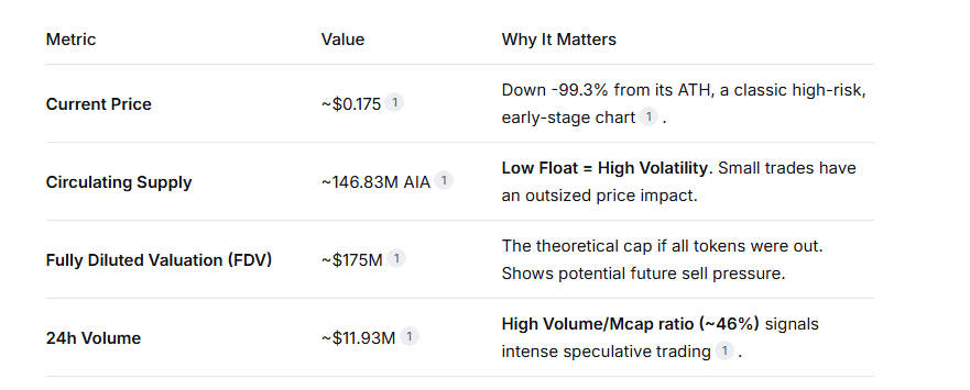 Pertama, pahami bahan bakarnya: hanya ~130M-147M token AIA yang beredar dari total 1 miliar. Itu adalah token dengan float rendah dan FDV tinggi. Dalam istilah sederhana, pasokan yang terbatas bertemu dengan pengenceran besar di masa depan. Ini membuat AIA menjadi panci tekanan. Pembelian atau penjualan yang sederhana menciptakan lonjakan harga yang liar—seperti yang terlihat dalam lonjakan harian 124% baru-baru ini dan koreksi dalam yang dalam