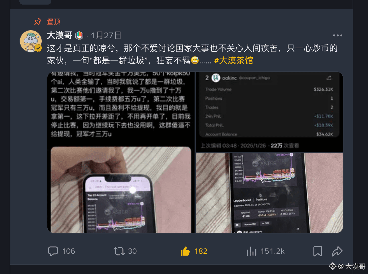 昨日的ASTER合约大赛成为了全网焦点。知名交易员“凉兮”在比赛中展现了惊人的爆发力,从1万U本金一度做到10万U,这种“过山车”般的剧情,不仅仅是一场个人的交易秀,更是对ASTER平台流动性与机制的一次硬核“压力测试”。