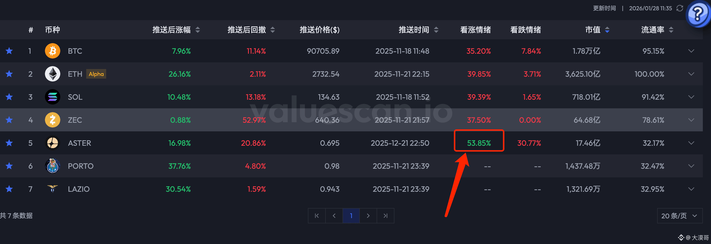 根据 ValueScan 的链上数据:ASTER的看涨情绪依然高达 53.85%。