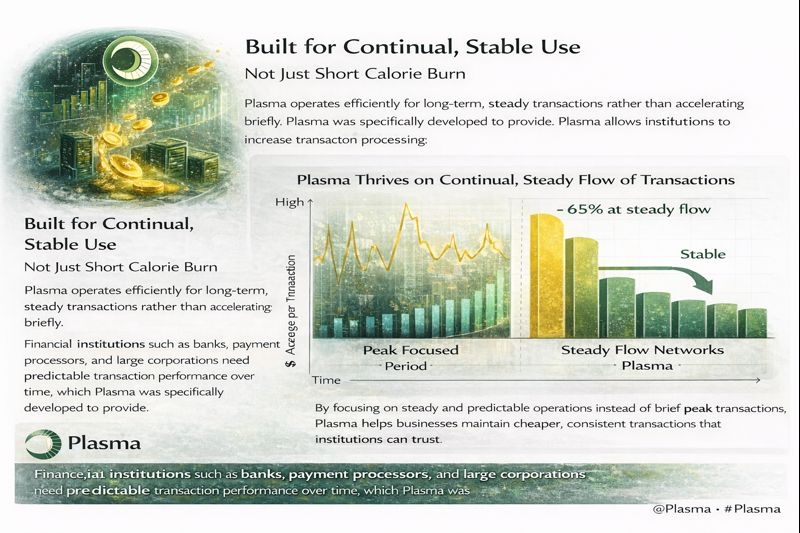 Banyak jaringan blockchain menangani permintaan mendadak, sejumlah besar transaksi yang datang hampir secara instan tetapi ini biasanya terlihat baik dalam uji tolok ukur karena lonjakan kinerja jangka pendek. Pada kenyataannya, sistem keuangan sehari-hari lebih bergantung pada konsistensi daripada kecepatan untuk lonjakan singkat. Lembaga keuangan seperti bank, pemroses pembayaran, dan perusahaan besar lainnya memerlukan sistem transaksional untuk berfungsi secara prediktif selama periode waktu yang diperpanjang dari jam ke jam dan hari ke hari. Plasma secara khusus dikembangkan dengan mempertimbangkan hal itu, untuk menyediakan eksekusi yang stabil, koordinasi aktivitas yang lancar, dan pemrosesan transaksi yang dapat diandalkan dalam jangka panjang.