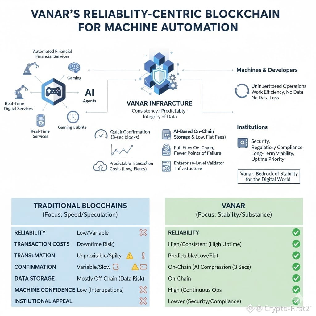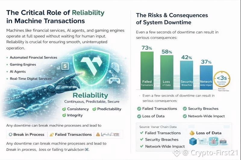 Keandalan memainkan peran penting dalam operasi sukses mesin ketika berinteraksi melalui pengambilan keputusan dan pemrosesan transaksi. Dengan demikian, keandalan bukan lagi sekadar hal yang diinginkan atau manfaat tambahan, tetapi merupakan persyaratan dasar. Layanan keuangan otomatis, mesin permainan, agen AI, dan layanan digital waktu nyata beroperasi dengan kecepatan dan akurasi yang lengkap, yang berarti mereka tidak memerlukan waktu untuk menanyakan atau menerima koreksi dari manusia, mereka segera dalam tanggapannya. Di sinilah filosofi Vanar untuk sistem desain menjadi unik, fokusnya adalah menciptakan infrastruktur di mana mesin dapat memiliki kepercayaan dan stabilitas dalam beroperasi secara terus-menerus tanpa gangguan, di mana gangguan bahkan selama beberapa detik karena waktu henti akan menciptakan jeda dalam proses, kehilangan data, atau transaksi yang gagal, oleh karena itu menjadikan keandalan sebagai pondasi di mana segala sesuatu yang lain dibangun.