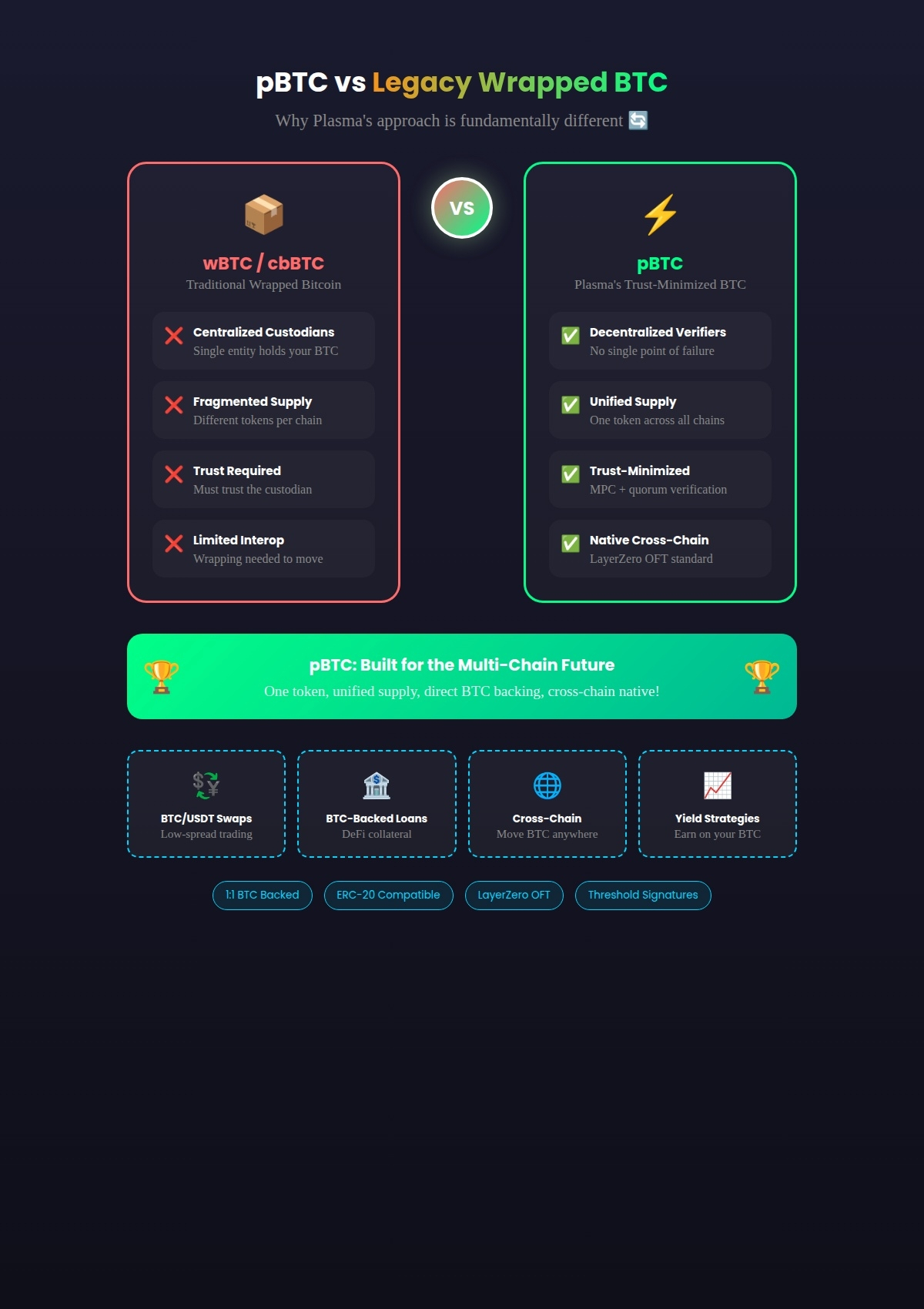 Perbedaan dari Bitcoin yang dibungkus warisan sangat penting. Implementasi BTC yang dibungkus tradisional seperti wBTC bergantung pada kustodian terpusat yang menerbitkan token per rantai, memfragmentasi pasokan dan meningkatkan persyaratan kepercayaan. pBTC mengambil pendekatan yang secara fundamental berbeda.