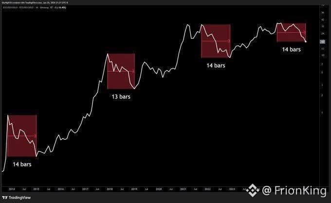 Mỗi chu kỳ “bear market” của tỷ lệ Bitcoin/Vàng thường kéo dài khoảng 14 tháng.