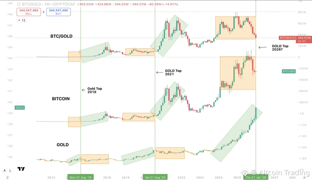 Подобная картина наблюдалась в 2016 и 2021 годах. Золото сначала проходило свою основную фазу роста, в то время как крипторынок оставался в состоянии консолидации. Только после того, как рост металлов завершался и формировалась вершина, биткоин начинал собственное параболическое движение.