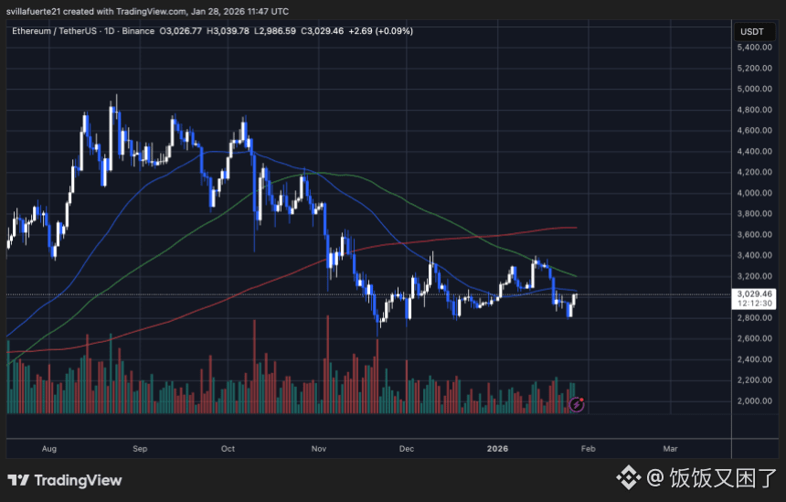 目前以太坊主要在 2800 美元至 3400 美元区间内运行。下方 2800 美元是关键防线,只要守住,市场仍可视为震荡筑底;一旦有效跌破,2500–2600 美元区域将成为下一站。反过来,若想真正改善结构,ETH 至少需要重新站回 3300–3400 美元区间。