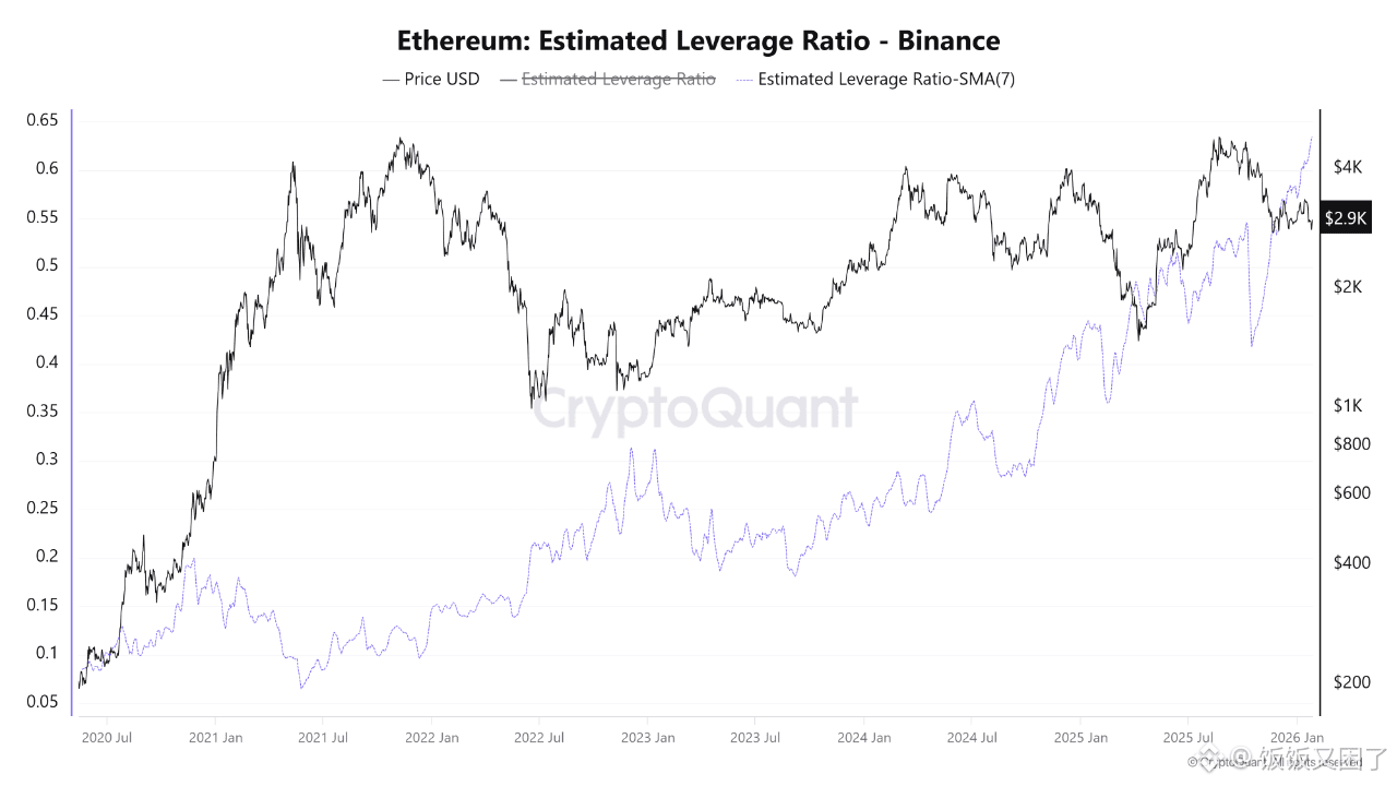 CryptoQuant 最新报告指出,以太坊在币安的预估杠杆率仍接近历史高位,7 日均线约为 0.632。这意味着,市场中大量仓位依赖杠杆支撑,价格对突发行情的承受能力正在下降。