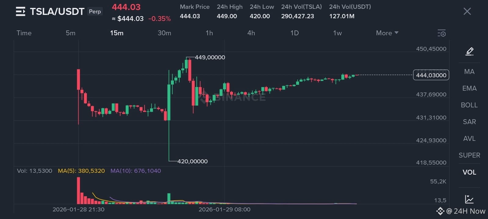 Binance cung cấp đòn bẩy lên đến 25x. Nghe hấp dẫn, nhưng hãy nhớ: biến động 4% trong pre-market là chuyện bình thường. Với đòn bẩy 25x, bạn sẽ bị thanh lý (liquidation) chỉ với biến động 4% ngược chiều lệnh. Trong khi đó, cổ phiếu TSLA nổi tiếng với những cây nến "bốc đầu" 5-6% chỉ vì một dòng tweet của Elon Musk. Tài khoản có thể "bốc hơi" trước khi bạn kịp nhấn nút đóng lệnh.