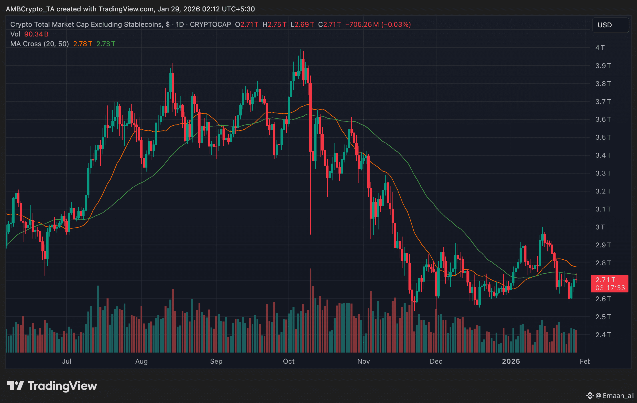 Broader crypto market data suggests investors responded cautiously to the press conference. The total crypto market capitalization excluding stablecoins hovered near $2.7 trillion, showing little change in the hours following Powell’s remarks.