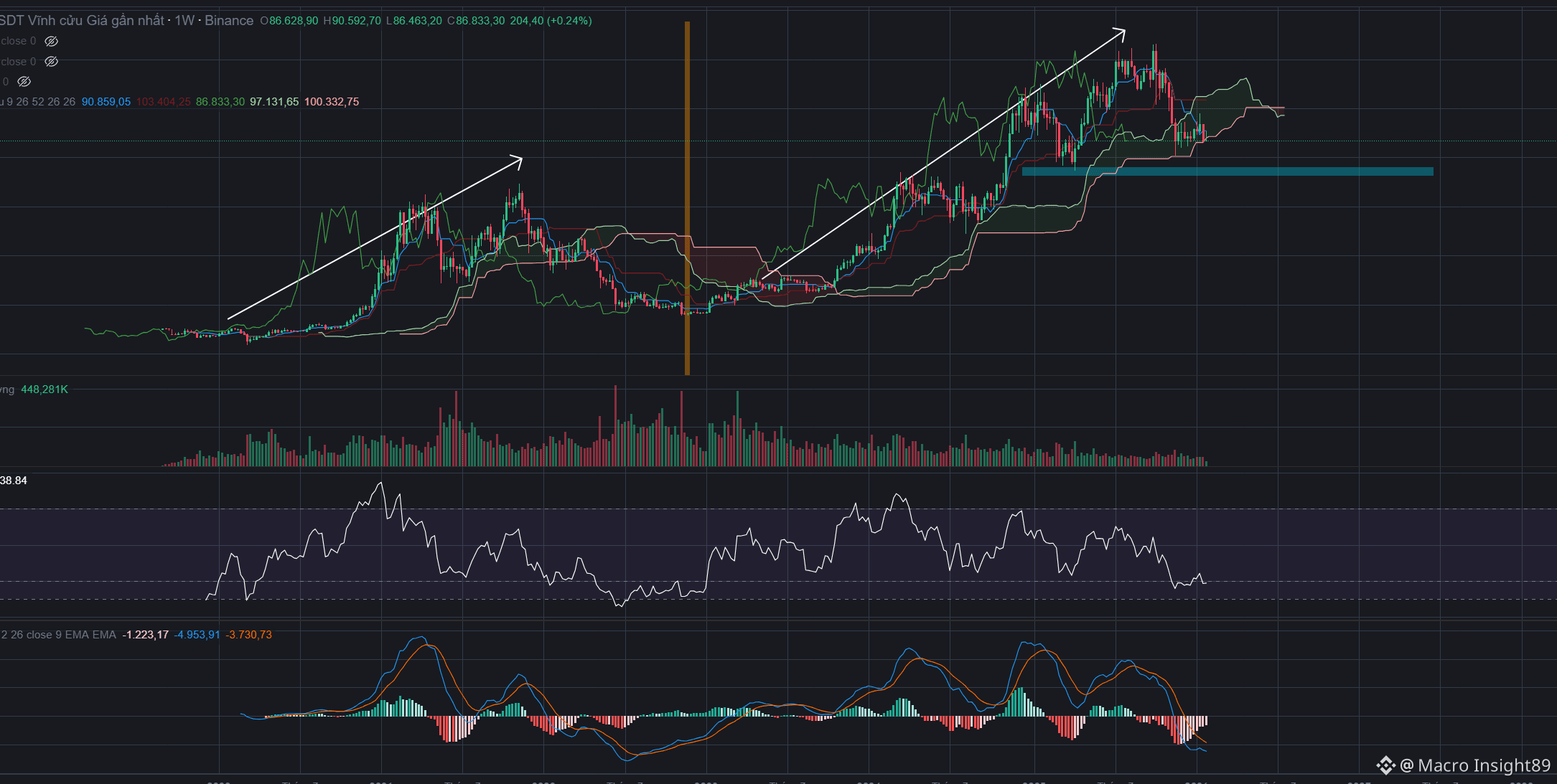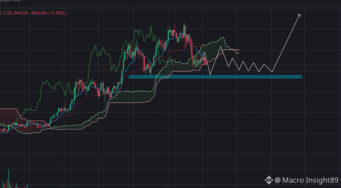 Hiện tại khung 1h (hình dưới) $BTC đang vận động dưới ICHIMOKU, sideway quanh biên động 90,000~87,000 từ chiều giờ mình không call kèo vì cũng muốn quan sát xem BTC, vì hiện tại LONG cũng khó mà SHORT cũng khó. LONG không được vì BTC gần tới mức hỗ trợ 87,000 và SHORT KHÔNG ĐƯỢC VÌ CŨNG GẦN TỚI ĐIỂM QUÁ BÁN dễ giựt lên lắm.