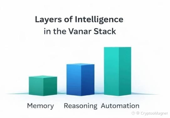 Traditional blockchains focus almost entirely on execution. Vanar introduces a layered intelligence model: Memory, Reasoning, and Automation. Memory allows systems to retain context and history. Reasoning enables interpretation and decision-making. Automation turns those decisions into real, repeatable actions. Together, these layers move blockchains closer to systems that don’t just run code but understand workflows.