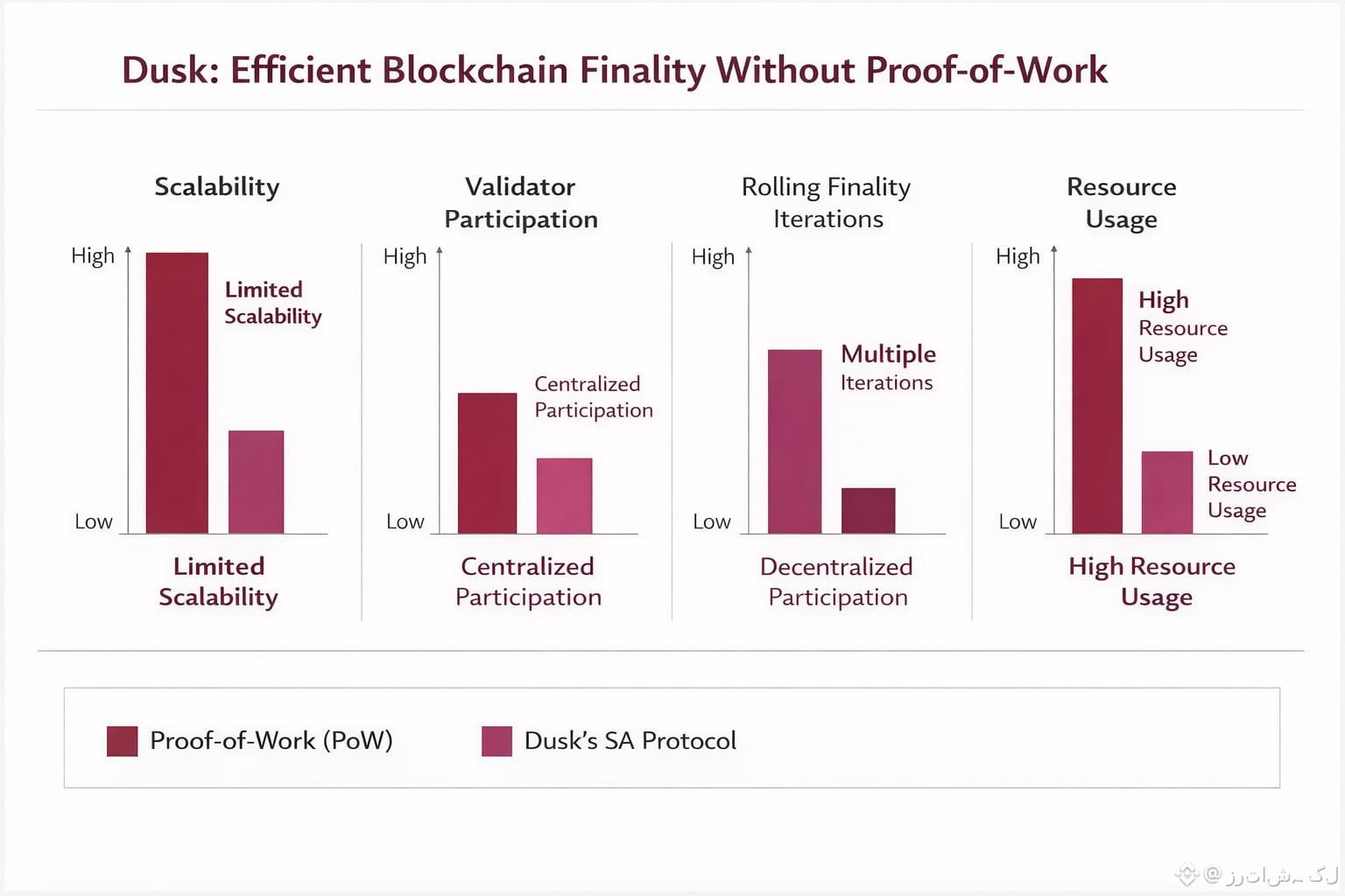 This already saves a lot of energy, but Dusk goes further. The protocol is designed around rolling finality. In many blockchains, blocks become “more final” over time after many confirmations and repeated work. This means the network keeps spending resources on the same history just to increase confidence. On Dusk, finality is handled more directly. The protocol limits how many steps are needed before a block is considered final. This reduces repeated work, reduces network load, and makes the system more predictable.