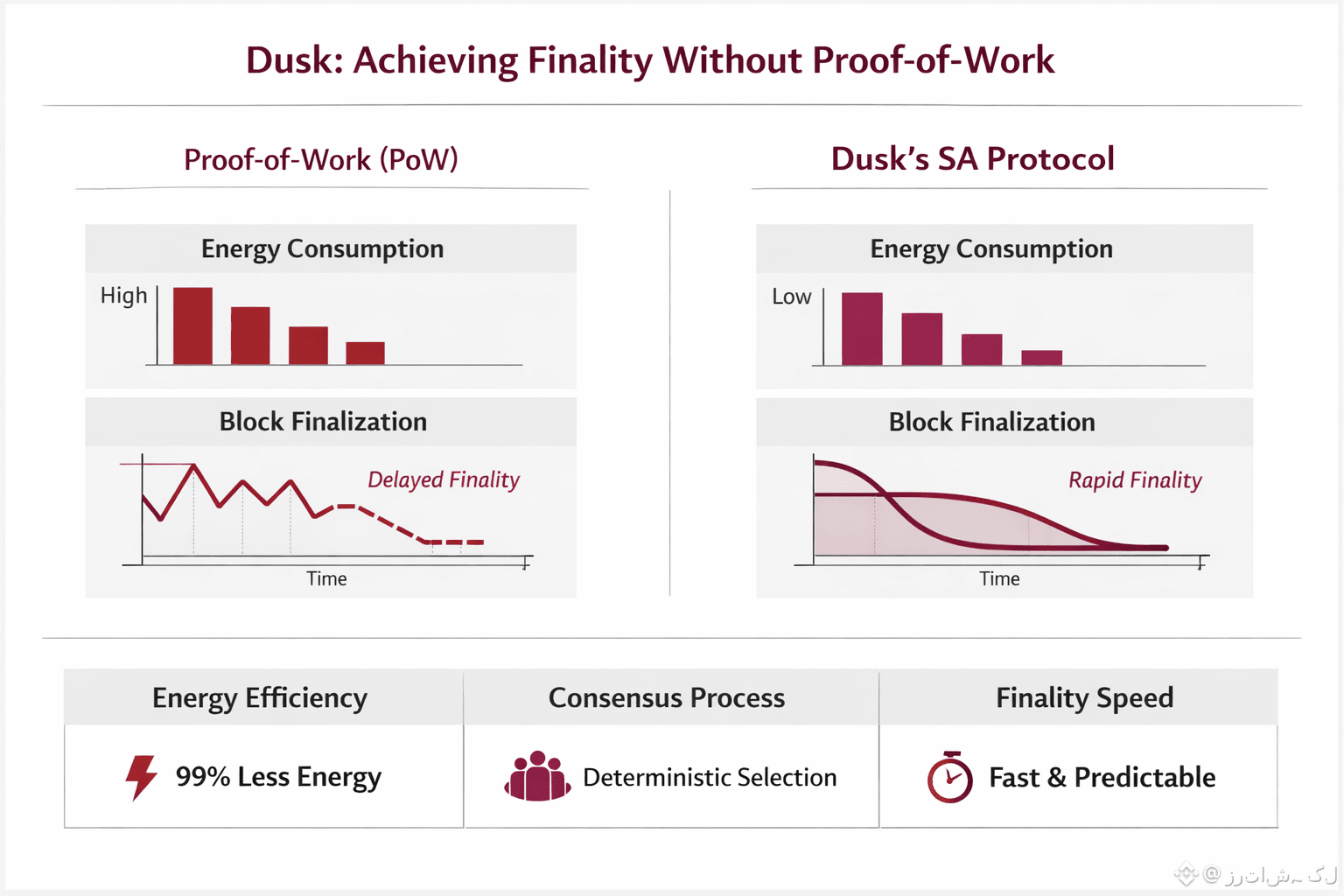 Dusk approaches this problem from a different direction. Instead of trying to improve proof-of-work, it uses a proof-of-stake based system called Succinct Attestation. The idea is simple, but the impact is important. Rather than asking the network to burn energy to prove it is honest, the network relies on staked value and clear rules to decide who produces and confirms blocks. This changes security from “who can spend the most electricity” to “who has something to lose if they behave badly.”