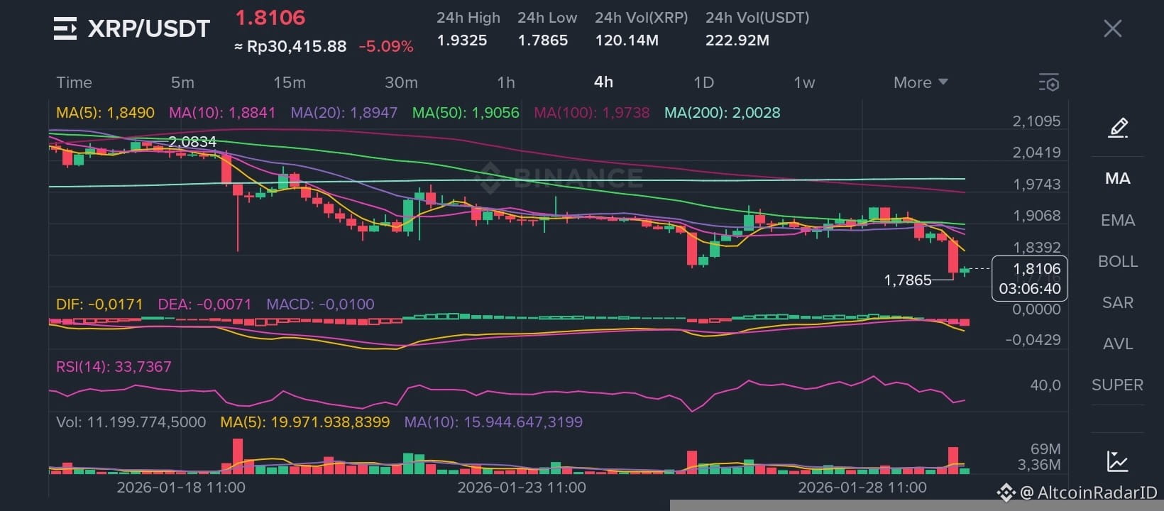 Price Action: $XRP baru saja "terjun bebas" dari area 1.94 dan saat ini tertahan di level 1.8090.