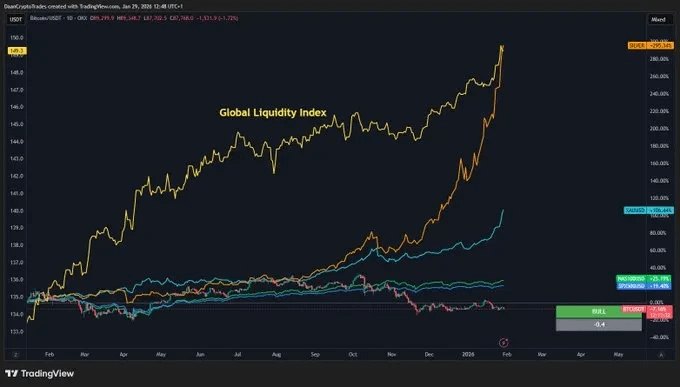 Trader dengan nama samaran DaanCrypto memperhatikan percepatan indeks likuiditas global pada awal tahun 2025. Menurutnya, "pergerakan signifikan" terjadi di semua kelas aset, kecuali Bitcoin.