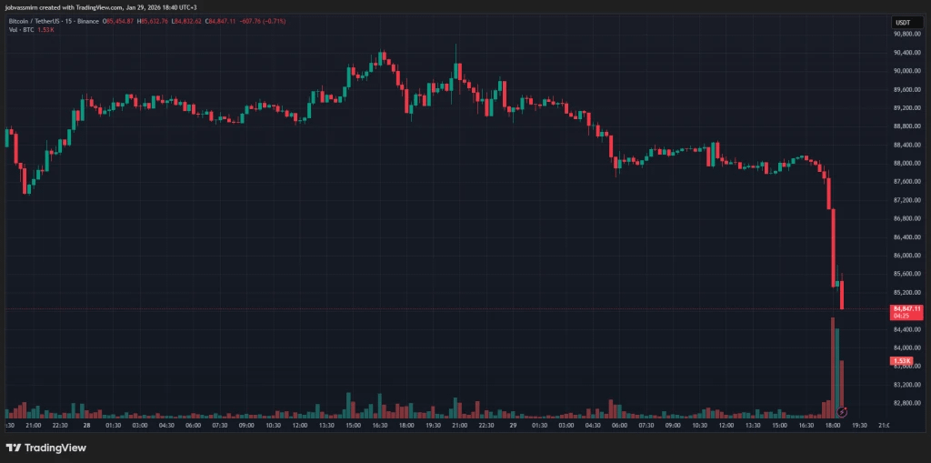29 Januari $BTC tiba-tiba anjlok dari $88 000 menjadi $85 000, kehilangan sekitar 3,5%. Penurunan ini mengikuti penurunan harga emas.