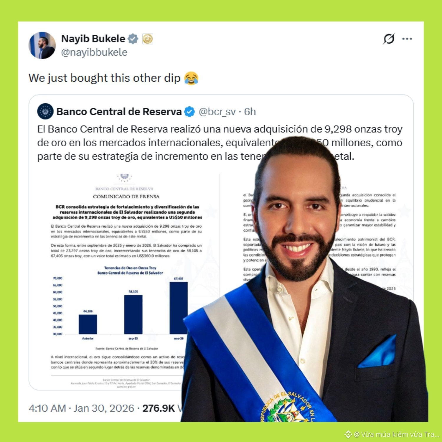 Tổng thống El Salvador vừa cho mua thêm số lượng vàng cực lớn lên tới 50 triệu USD, đưa tổng lượng vàng dự trữ quốc gia lên khoảng 360 triệu USD. Một động thái khá “tradfi”, phòng thủ, giữ giá trị.