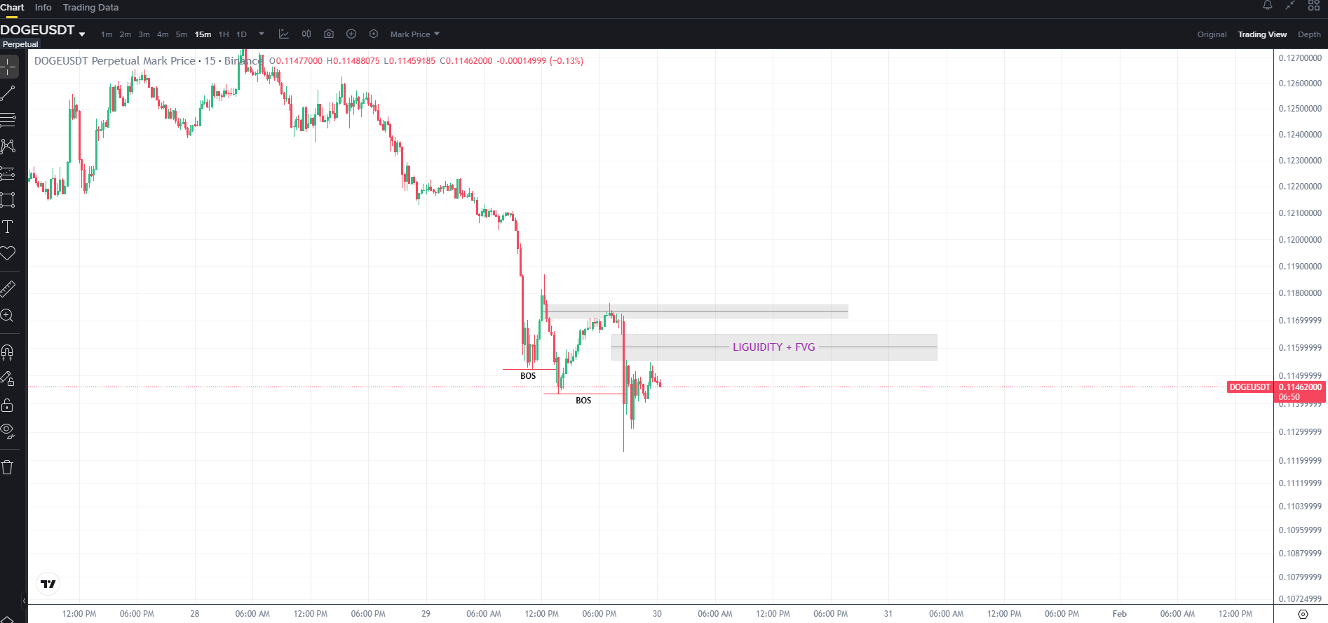 Seperti yang kita lihat di grafik, harga sedang menciptakan low yang lebih rendah atau harga sedang bearish sementara seluruh pasar crypto juga bearish. Jadi kita tidak akan melawan arus. Saya bisa melihat bahwa harga doge akan bergerak menyamping selama beberapa jam untuk menghasilkan likuiditas. Tetapi pada akhirnya, harga akan turun. Karena kita dapat melihat bahwa ada pelanggaran struktur pada harga yang bearish. Jadi masuk posisi panjang akan menjadi keputusan yang sepenuhnya salah. Kita juga dapat melihat di grafik bahwa ada FVG seperti yang saya tandai di grafik di bawah bahwa ada swing high jangka pendek + FVG. Jadi ada kemungkinan tinggi harga akan masuk ke FVG tersebut dengan mengambil likuiditas dan kemudian akhirnya akan jatuh. Jadi kita bisa masuk ke pasar dari situ.