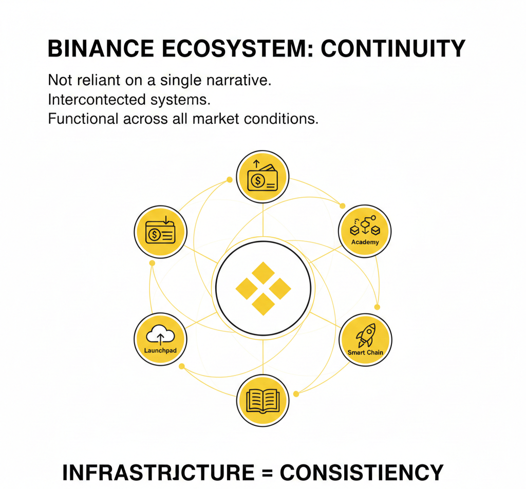 Dalam pasar yang dikenal karena ekstremnya, ekosistem Binance mewakili sesuatu yang lebih tenang: kesinambungan. Ia tidak bergantung pada satu narasi atau tren tunggal. Sebaliknya, ia membangun sistem yang saling terhubung yang tetap fungsional di berbagai kondisi.